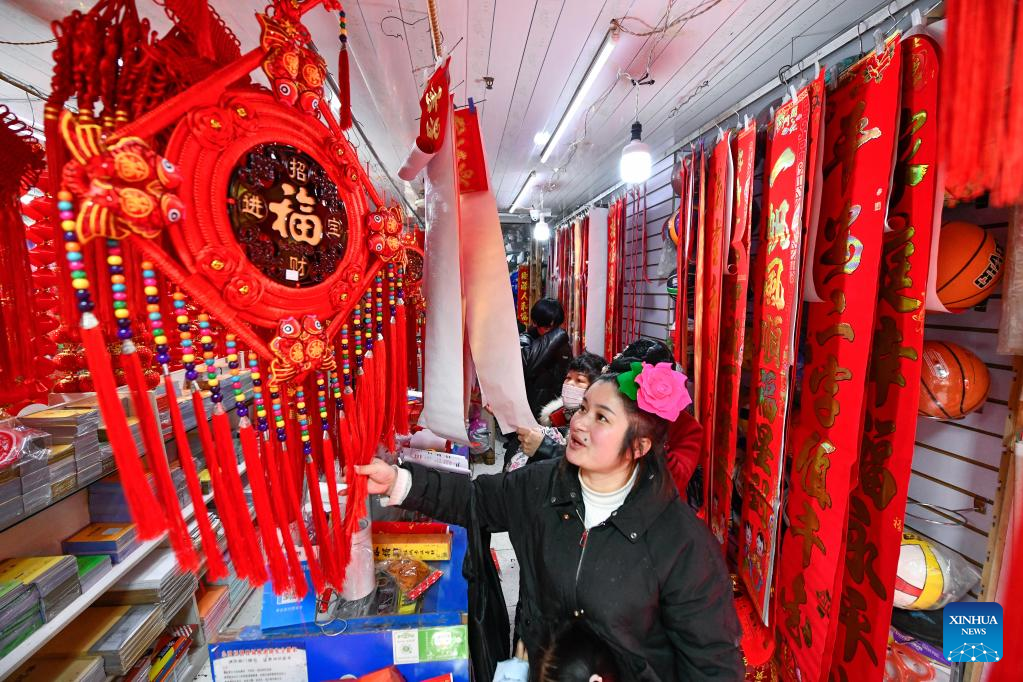 Yang Mei buys commodities for the upcoming Spring Festival in Kaili, southwest China's Guizhou Province, Jan. 30, 2022. Kaishao Village, embroiderer Yang Mei's hometown, used to be impoverished due to its poor soil and limited transport conditions. Lots of villagers here chose to work as immigrant workers in other places. In 2016, thanks to local poverty alleviation policies, Yang Mei's family got a chance to move to their new home at a relocation site in Kaili. With the help from skill training sessions and supportive funding from government, Yang started her own business by establishing a garment factory in 2018. The factory makes local ethnic clothing, work outfits and dancing clothes. Currently, the factory has employed about 100 relocated people. She also initiated an embroidery cooperative, aiming to help boost the incomes of those embroiders who have to work from home. When it comes to her New Year wish, Yang hopes her business can grow bigger and all her relocated fellows' incomes continue to increase in the Year of the Tiger. (Xinhua/Yang Wenbin)