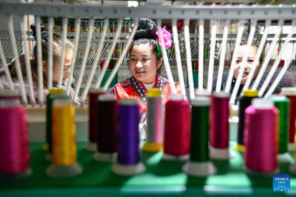 Yang Mei (R) introduces cloth to a customer at her garment factory in Kaili, southwest China's Guizhou Province, Jan. 30, 2022. Kaishao Village, embroiderer Yang Mei's hometown, used to be impoverished due to its poor soil and limited transport conditions. Lots of villagers here chose to work as immigrant workers in other places. In 2016, thanks to local poverty alleviation policies, Yang Mei's family got a chance to move to their new home at a relocation site in Kaili. With the help from skill training sessions and supportive funding from government, Yang started her own business by establishing a garment factory in 2018. The factory makes local ethnic clothing, work outfits and dancing clothes. Currently, the factory has employed about 100 relocated people. She also initiated an embroidery cooperative, aiming to help boost the incomes of those embroiders who have to work from home. When it comes to her New Year wish, Yang hopes her business can grow bigger and all her relocated fellows' incomes continue to increase in the Year of the Tiger. (Xinhua/Yang Wenbin)