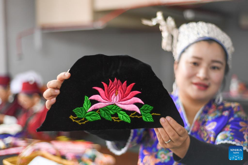 Yang Mei shows a piece of works made by an embroidery cooperative in Kaili, southwest China's Guizhou Province, Oct. 18, 2020. Kaishao Village, embroiderer Yang Mei's hometown, used to be impoverished due to its poor soil and limited transport conditions. Lots of villagers here chose to work as immigrant workers in other places. In 2016, thanks to local poverty alleviation policies, Yang Mei's family got a chance to move to their new home at a relocation site in Kaili. With the help from skill training sessions and supportive funding from government, Yang started her own business by establishing a garment factory in 2018. The factory makes local ethnic clothing, work outfits and dancing clothes. Currently, the factory has employed about 100 relocated people. She also initiated an embroidery cooperative, aiming to help boost the incomes of those embroiders who have to work from home. When it comes to her New Year wish, Yang hopes her business can grow bigger and all her relocated fellows' incomes continue to increase in the Year of the Tiger. (Photo by Cai Xingwen/Xinhua)