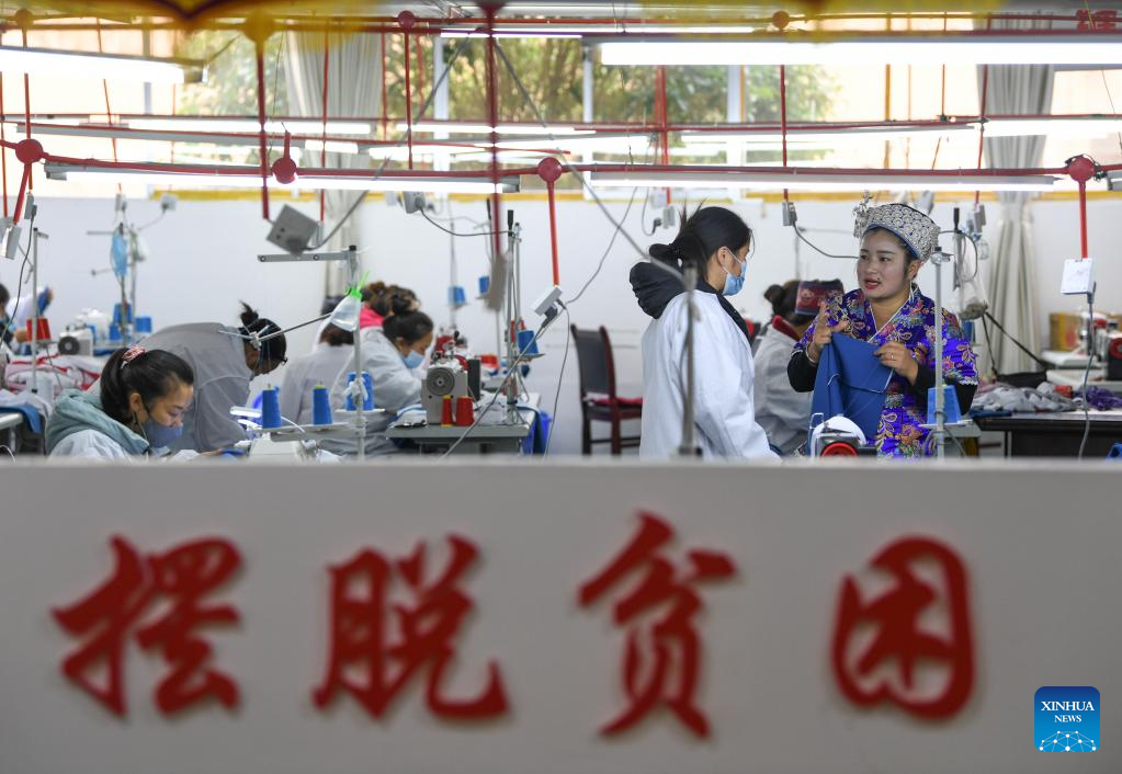 Yang Mei (1st, R) talks with workers at her garment factory in Kaili, southwest China's Guizhou Province, Oct. 18, 2020. Kaishao Village, embroiderer Yang Mei's hometown, used to be impoverished due to its poor soil and limited transport conditions. Lots of villagers here chose to work as immigrant workers in other places. In 2016, thanks to local poverty alleviation policies, Yang Mei's family got a chance to move to their new home at a relocation site in Kaili. With the help from skill training sessions and supportive funding from government, Yang started her own business by establishing a garment factory in 2018. The factory makes local ethnic clothing, work outfits and dancing clothes. Currently, the factory has employed about 100 relocated people. She also initiated an embroidery cooperative, aiming to help boost the incomes of those embroiders who have to work from home. When it comes to her New Year wish, Yang hopes her business can grow bigger and all her relocated fellows' incomes continue to increase in the Year of the Tiger. (Photo by Cai Xingwen/Xinhua)