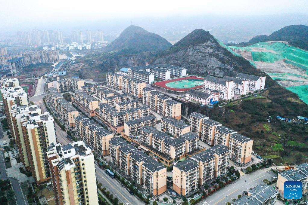 Aerial photo taken on Jan. 30, 2022 shows a relocation site in Kaili, southwest China's Guizhou Province. Kaishao Village, embroiderer Yang Mei's hometown, used to be impoverished due to its poor soil and limited transport conditions. Lots of villagers here chose to work as immigrant workers in other places. In 2016, thanks to local poverty alleviation policies, Yang Mei's family got a chance to move to their new home at a relocation site in Kaili. With the help from skill training sessions and supportive funding from government, Yang started her own business by establishing a garment factory in 2018. The factory makes local ethnic clothing, work outfits and dancing clothes. Currently, the factory has employed about 100 relocated people. She also initiated an embroidery cooperative, aiming to help boost the incomes of those embroiders who have to work from home. When it comes to her New Year wish, Yang hopes her business can grow bigger and all her relocated fellows' incomes continue to increase in the Year of the Tiger. (Xinhua/Yang Wenbin)