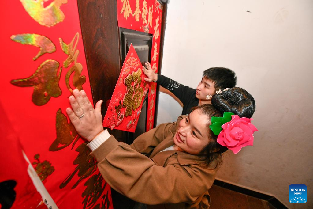 Yang Mei (R) pastes couplets at her home in Kaili, southwest China's Guizhou Province, Jan. 30, 2022. Kaishao Village, embroiderer Yang Mei's hometown, used to be impoverished due to its poor soil and limited transport conditions. Lots of villagers here chose to work as immigrant workers in other places. In 2016, thanks to local poverty alleviation policies, Yang Mei's family got a chance to move to their new home at a relocation site in Kaili. With the help from skill training sessions and supportive funding from government, Yang started her own business by establishing a garment factory in 2018. The factory makes local ethnic clothing, work outfits and dancing clothes. Currently, the factory has employed about 100 relocated people. She also initiated an embroidery cooperative, aiming to help boost the incomes of those embroiders who have to work from home. When it comes to her New Year wish, Yang hopes her business can grow bigger and all her relocated fellows' incomes continue to increase in the Year of the Tiger. (Xinhua/Yang Wenbin)