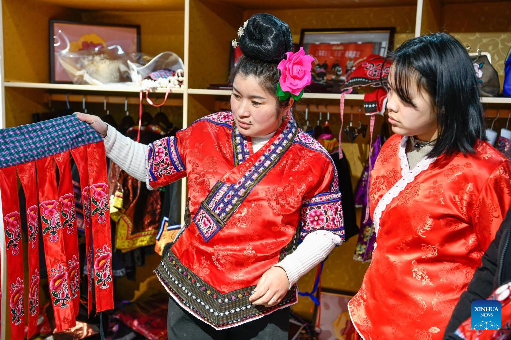 Yang Mei (L) recommends ethnic clothes to a customer at her garment factory in Kaili, southwest China's Guizhou Province, Jan. 30, 2022. Kaishao Village, embroiderer Yang Mei's hometown, used to be impoverished due to its poor soil and limited transport conditions. Lots of villagers here chose to work as immigrant workers in other places. In 2016, thanks to local poverty alleviation policies, Yang Mei's family got a chance to move to their new home at a relocation site in Kaili. With the help from skill training sessions and supportive funding from government, Yang started her own business by establishing a garment factory in 2018. The factory makes local ethnic clothing, work outfits and dancing clothes. Currently, the factory has employed about 100 relocated people. She also initiated an embroidery cooperative, aiming to help boost the incomes of those embroiders who have to work from home. When it comes to her New Year wish, Yang hopes her business can grow bigger and all her relocated fellows' incomes continue to increase in the Year of the Tiger. (Xinhua/Yang Wenbin)