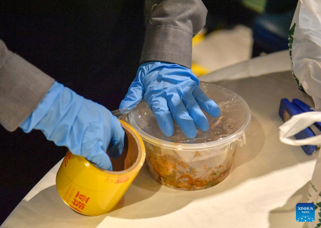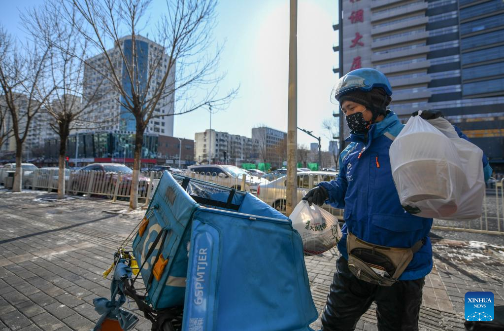 A deliveryman prepares customers' pre-ordered meals for delivery in Nankai District, north China's Tianjin, Jan. 31, 2022. In areas classified as low risk for COVID-19 in Tianjin, some restaurants have introduced takeout service for the holiday feasts. The service not only satisfies customers' demand but also can help to prevent the spread of COVID-19.