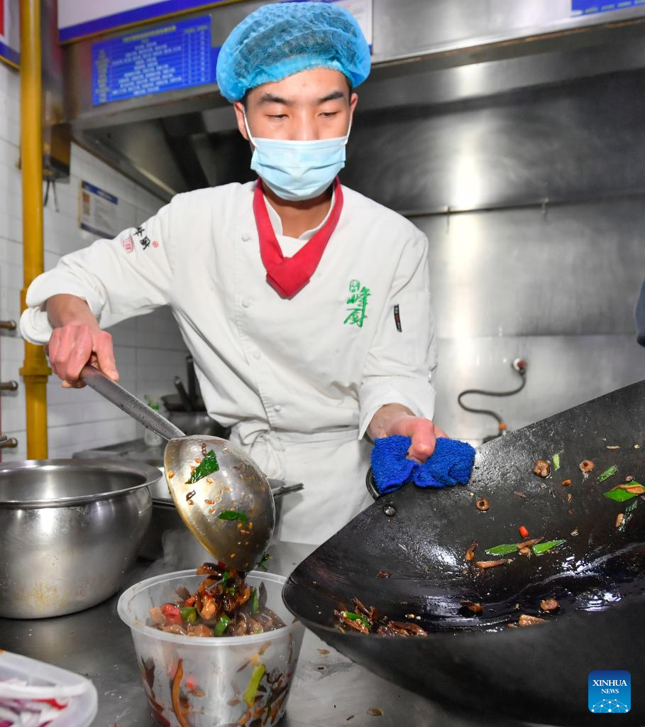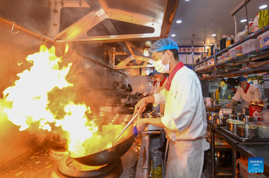 A chef cooks at a restaurant in Nankai District, north China's Tianjin, Jan. 31, 2022. In areas classified as low risk for COVID-19 in Tianjin, some restaurants have introduced takeout service for the holiday feasts. The service not only satisfies customers' demand but also can help to prevent the spread of COVID-19.