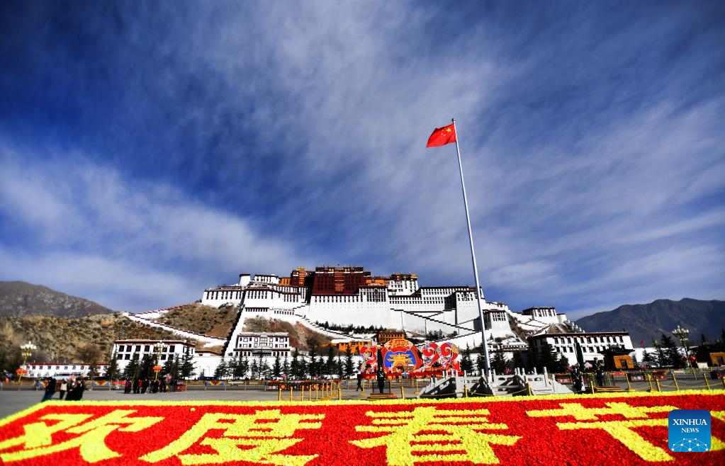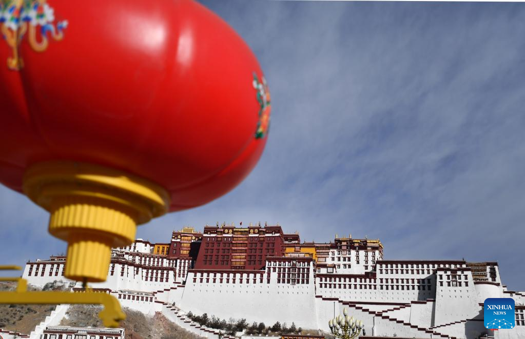 Photo taken on Jan. 31, 2022 shows a view of the Potala Palace square decorated with Spring Festival elements in Lhasa, southwest China's Tibet Autonomous Region. The Spring Festival falls on Feb. 1 this year. (Xinhua/Chogo)