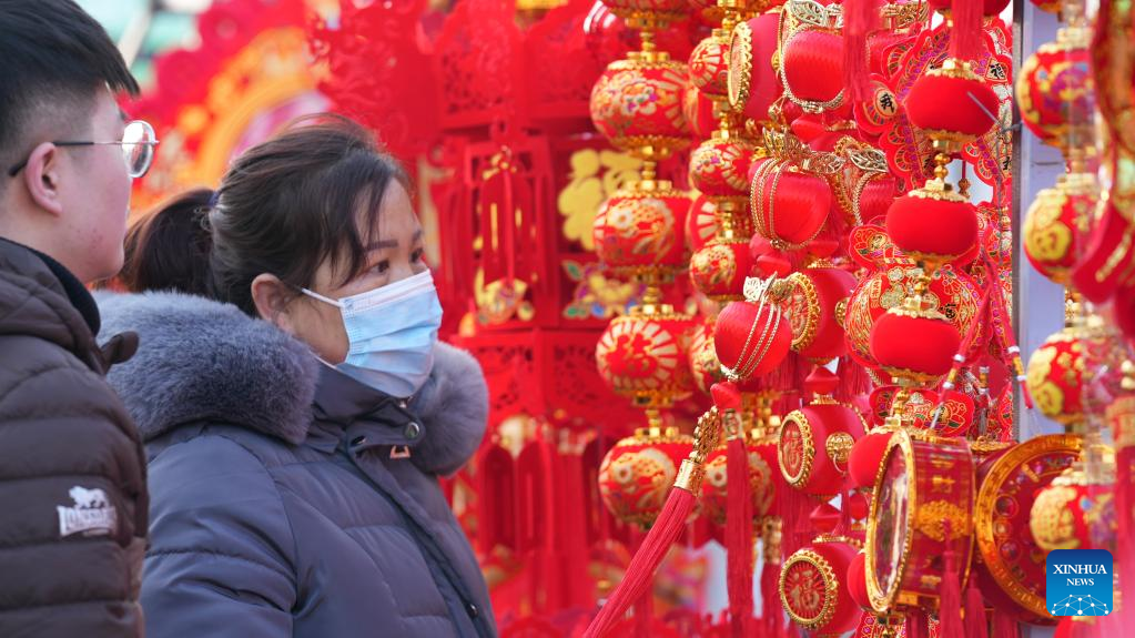 Citizens purchase red lanterns at a festive fair in Yinchuan, northwest China's Ningxia Hui Autonomous Region, Jan. 29, 2022. The Spring Festival falls on Feb. 1 this year. (Photo by Liu Yufei/Xinhua)