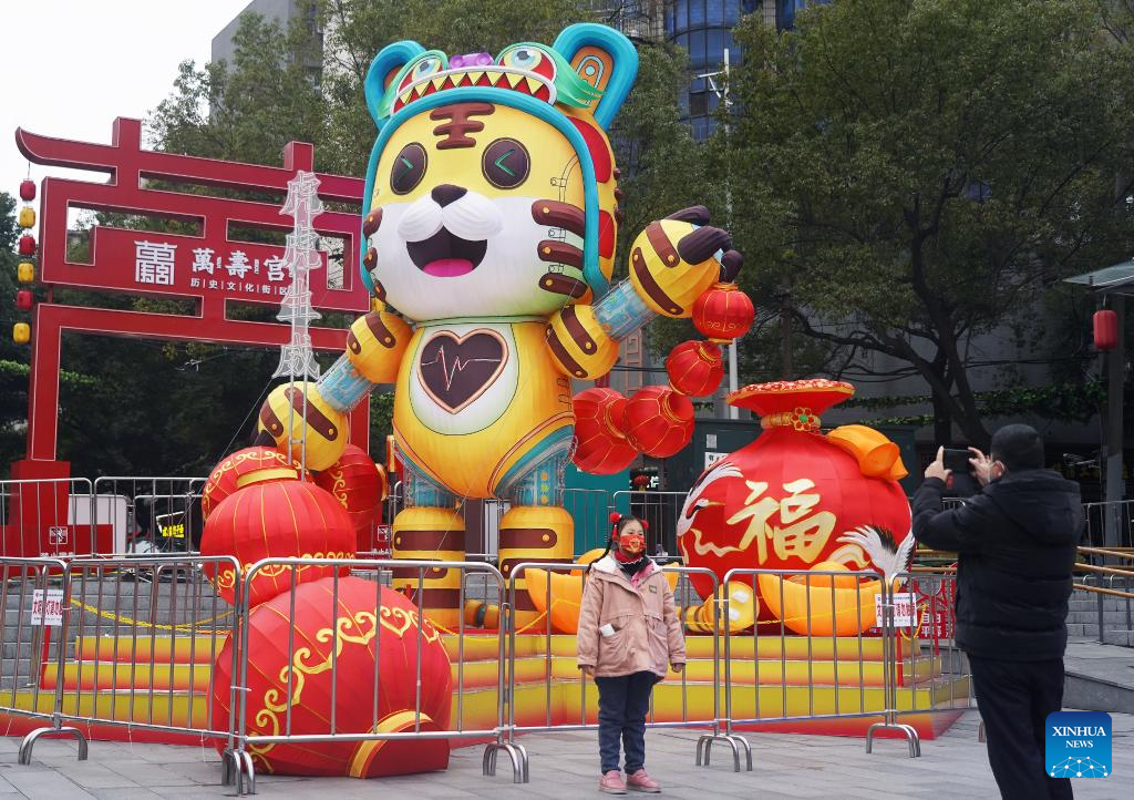 Citizens take photos with festive decorations in Nanchang, east China's Jiangxi Province, Jan. 31, 2022. The Spring Festival falls on Feb. 1 this year. (Xinhua/Wan Xiang)