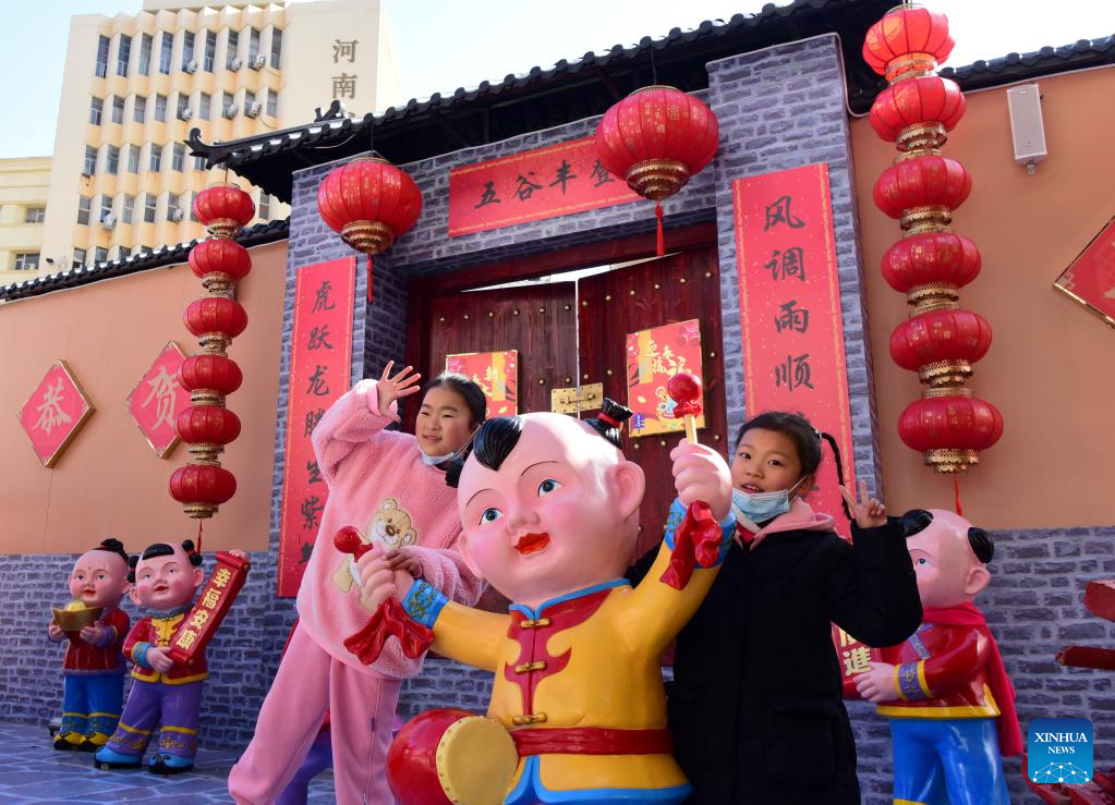 Children pose for a photo with festive decorations in Zhengzhou, central China's Henan Province, Jan. 31, 2022. The Spring Festival falls on Feb. 1 this year. (Xinhua/Zhu Xiang)