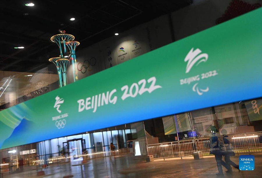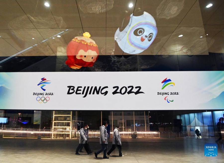 Staff members walk outside the Main Media Center for Beijing 2022 Winter Olympics in Beijing, capital of China, Feb. 1, 2022. (Xinhua/Wu Wei)