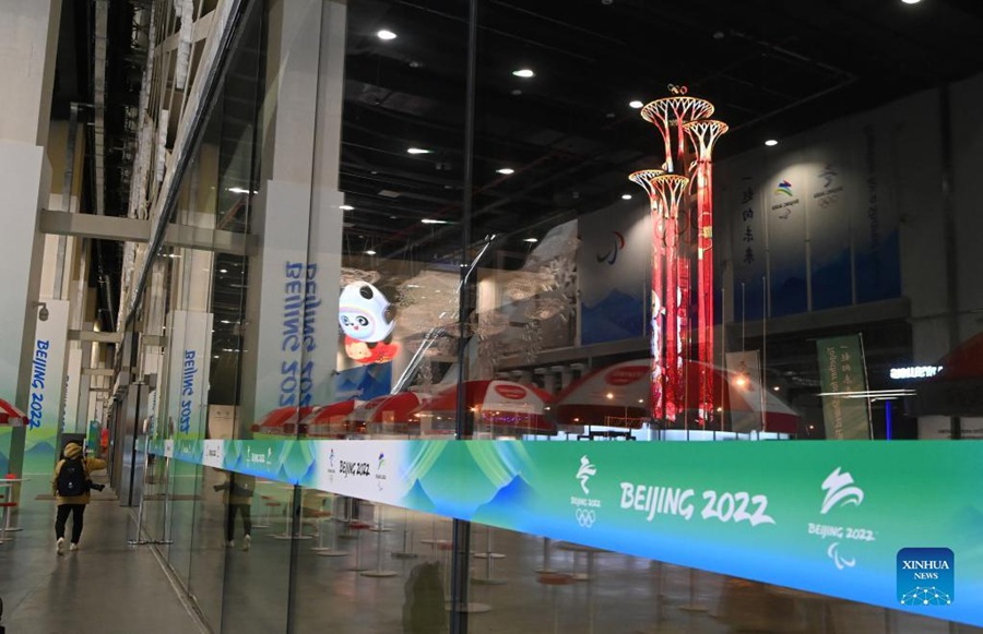 A journalist leaves the Main Media Center for Beijing 2022 Winter Olympics in Beijing, capital of China, Feb. 1, 2022. (Xinhua/Wu Wei)