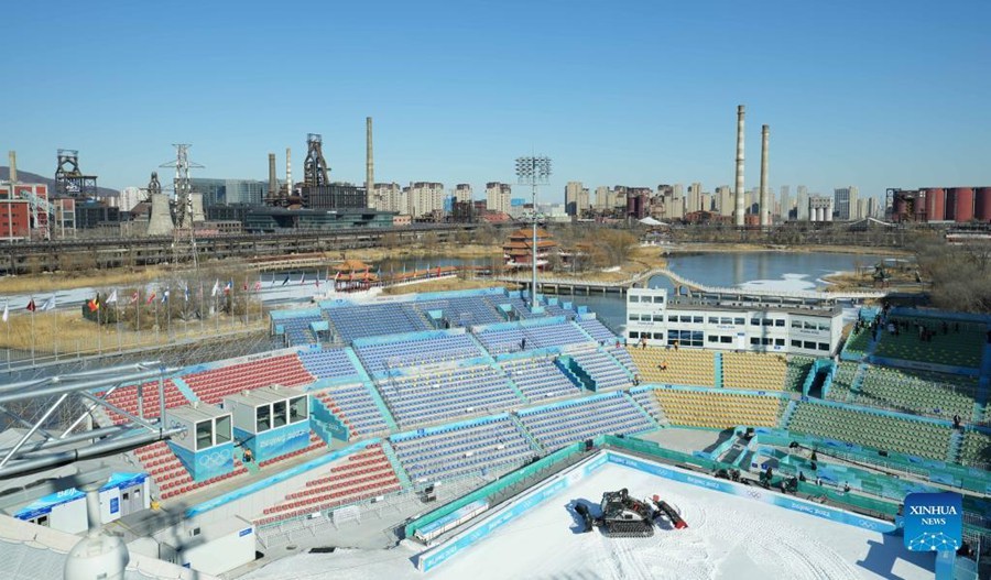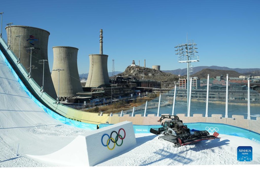A staff member drives a snow-grooming machine at Big Air Shougang, a venue for the Beijing 2022 Winter Olympic Games, in Beijing, capital of China, Feb. 1, 2022. (Xinhua/Chen Jianli)