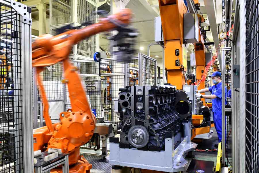 Robotic arms assemble engines at a workshop of the Weichai Power Co., Ltd. in Weifang City, east China's Shandong province, April 22, 2021. (Xinhua/Guo Xulei)