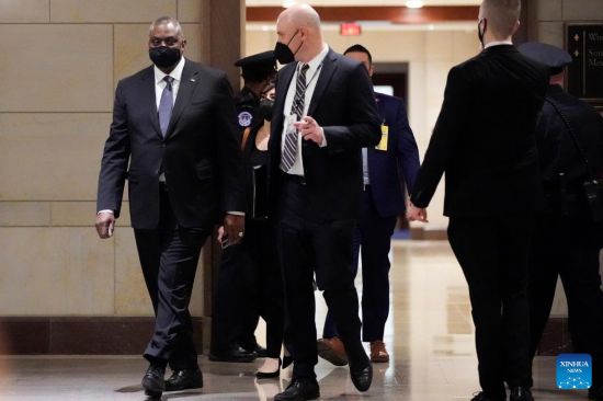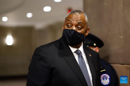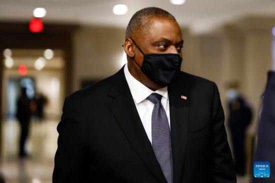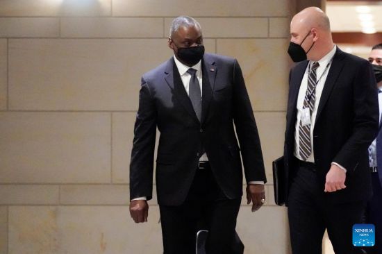 U.S. Defense Secretary Lloyd Austin arrives to attend a closed-door hearing on Capitol Hill in Washington, D.C., the United States, on Feb. 2, 2022. The United States will deploy additional troops to Europe, the Defense Department announced Wednesday, citing tensions on Ukraine's borders. (Photo by Ting Shen/Xinhua)