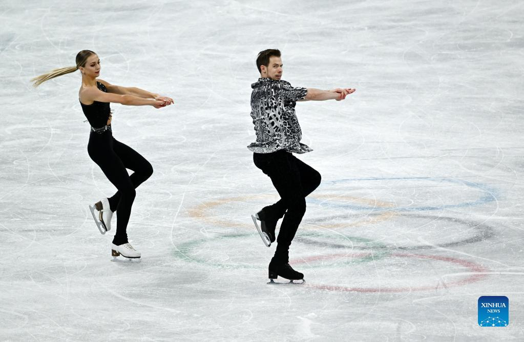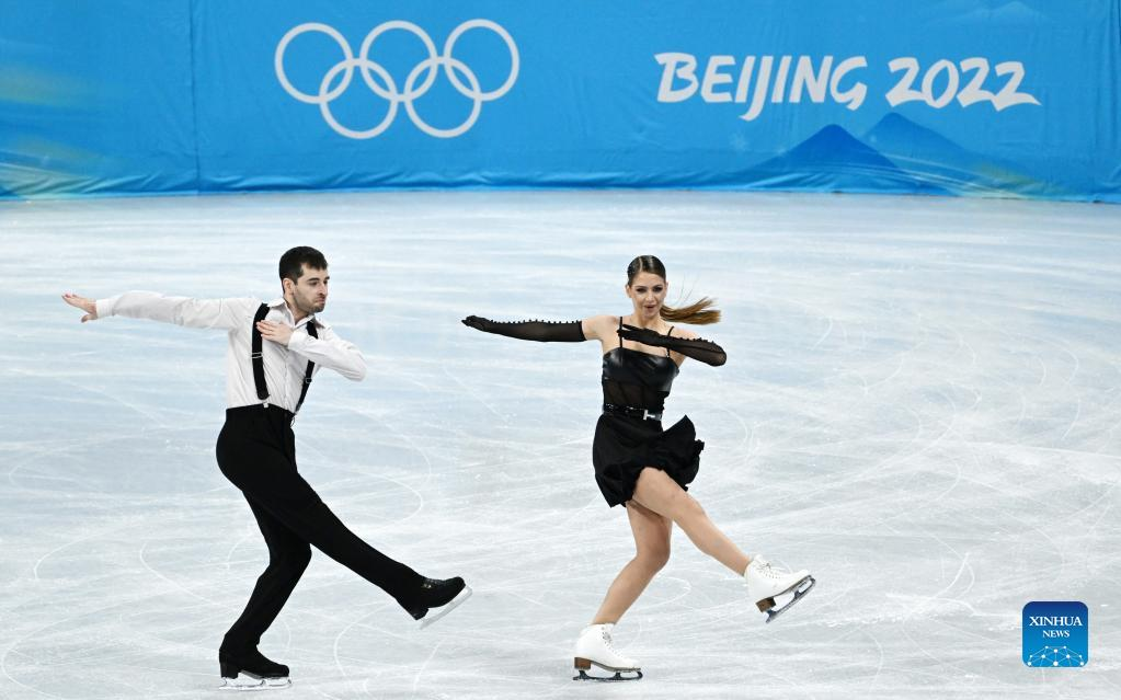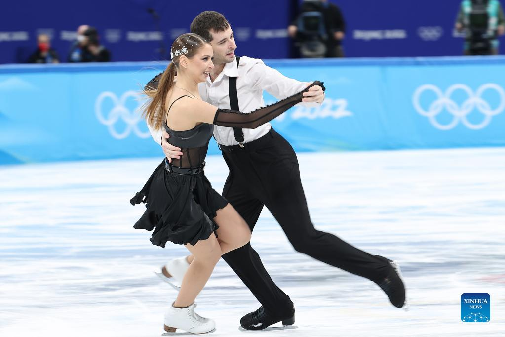 Oleksandra Nazarova (L) /Maksym Nikitin of Ukraine perform during the figure skating team event ice dance rhythm dance at Capital Indoor Stadium in Beijing, capital of China, Feb. 4, 2022. (Xinhua/Zhang Yuwei)