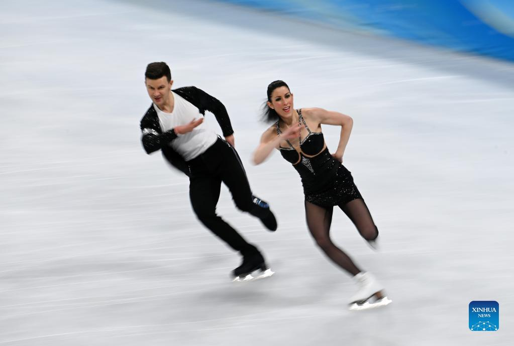 Oleksandra Nazarova (R) /Maksym Nikitin of Ukraine perform during the figure skating team event ice dance rhythm dance at Capital Indoor Stadium in Beijing, capital of China, Feb. 4, 2022. (Xinhua/Wang Jianwei)