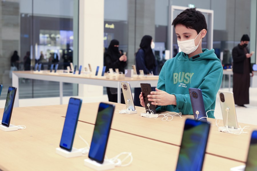 A Saudi kid visits Huawei's largest overseas store on its opening day in Riyadh, Saudi Arabia, Feb. 2, 2022. (Xinhua/Wang Haizhou)