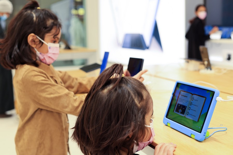 Saudi Kids try smart products at Huawei's largest overseas store on its opening day in Riyadh, Saudi Arabia, Feb. 2, 2022. (Xinhua/Wang Haizhou)