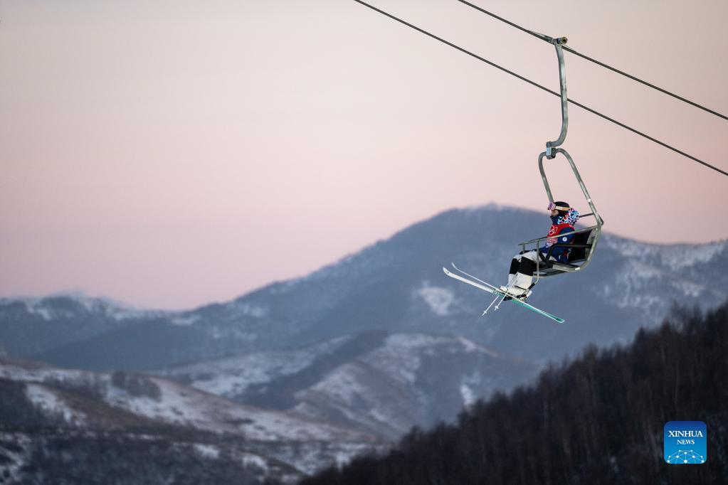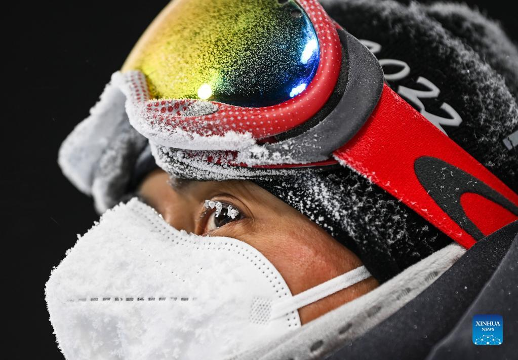 An athlete prepares to compete in the freestyle skiing women's moguls qualification during the Beijing 2022 Winter Olympic Games at the Genting Snow Park in Zhangjiakou, north China's Hebei Province, Feb. 3, 2022. (Xinhua/Xiao Yijiu)
