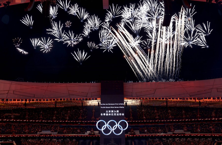 Fireworks illuminate the night sky during the opening ceremony of the Beijing 2022 Olympic Winter Games at the National Stadium in Beijing on Feb. 4, 2022. (Xinhua/Chen Jianli)