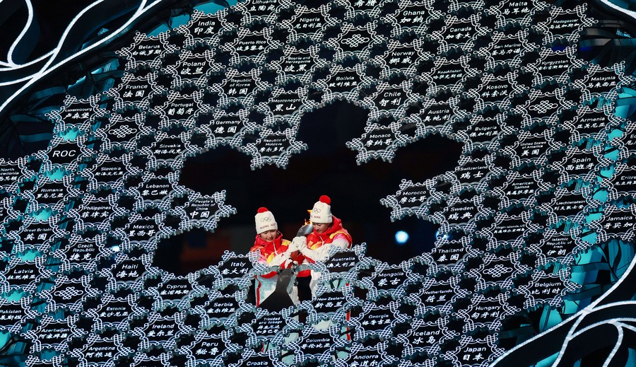 The cauldron is lit by Dinigeer Yilamujiang (L) and Zhao Jiawen during the opening ceremony of the Beijing 2022 Olympic Winter Games. (Xinhua/Liu Xu)