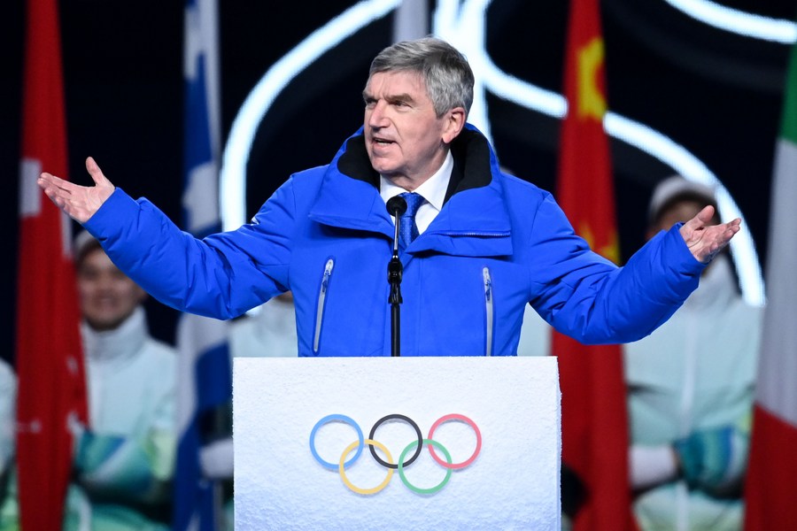 International Olympic Committee (IOC) president Thomas Bach addresses the opening ceremony of the Beijing 2022 Olympic Winter Games. (Xinhua/Li Ga)