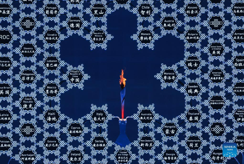 The cauldron is lit during the opening ceremony of the Beijing 2022 Olympic Winter Games at the National Stadium in Beijing, capital of China, Feb. 4, 2022. (Xinhua/Cao Can)