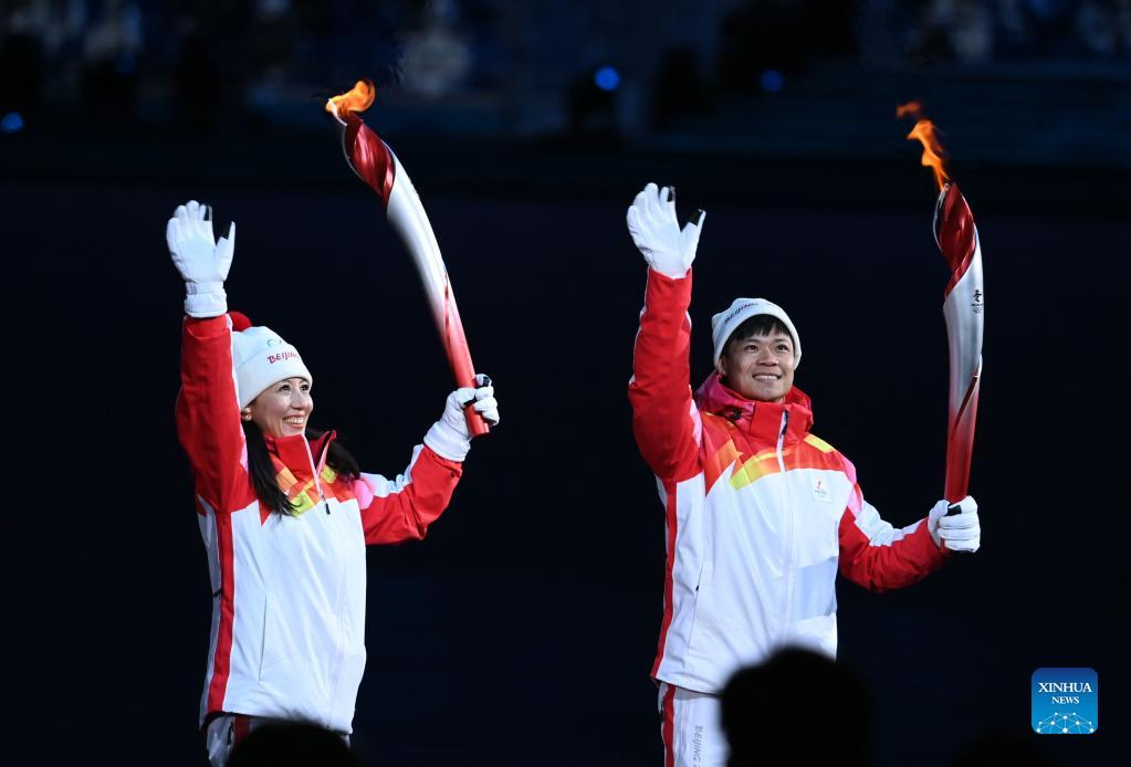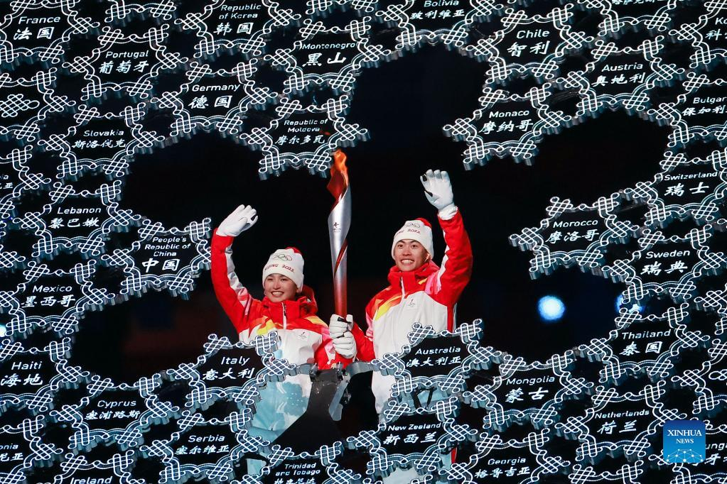 Torch bearers Dinigeer Yilamujiang (L) and Zhao Jiawen holding the last torch gesture during the opening ceremony of the Beijing 2022 Olympic Winter Games at the National Stadium in Beijing, capital of China, Feb. 4, 2022. (Xinhua/Cao Can)