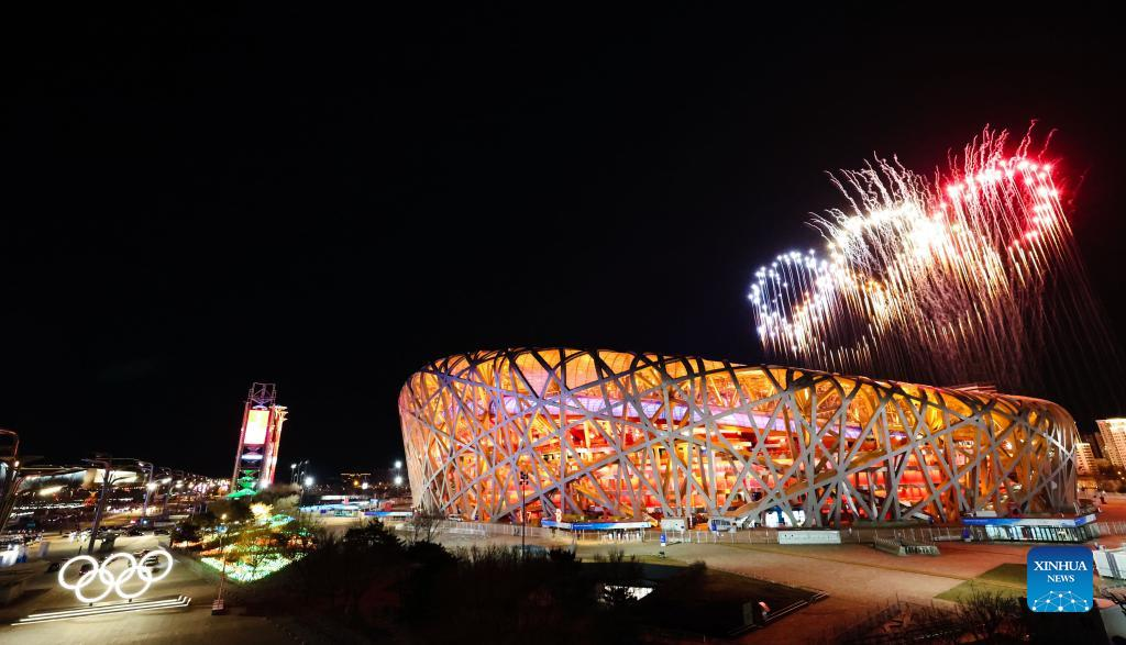Fireworks illuminate the night sky over the National Stadium during the opening ceremony of the Beijing 2022 Olympic Winter Games in Beijing, capital of China, Feb. 4, 2022. (Xinhua/Li Ziheng)
