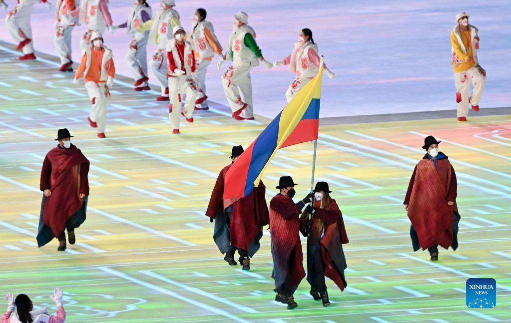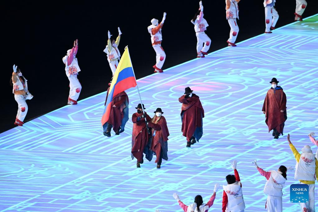The Olympic delegation of Colombia parade into the National Stadium during the opening ceremony of the Beijing 2022 Olympic Winter Games in Beijing, capital of China, Feb. 4, 2022. (Xinhua/Li Ziheng)