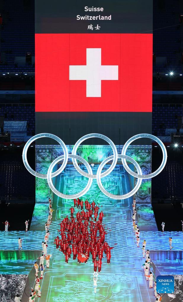 The Olympic delegation of Switzerland parade into the National Stadium during the opening ceremony of the Beijing 2022 Olympic Winter Games in Beijing, capital of China, Feb. 4, 2022. (Xinhua/Yang Lei)
