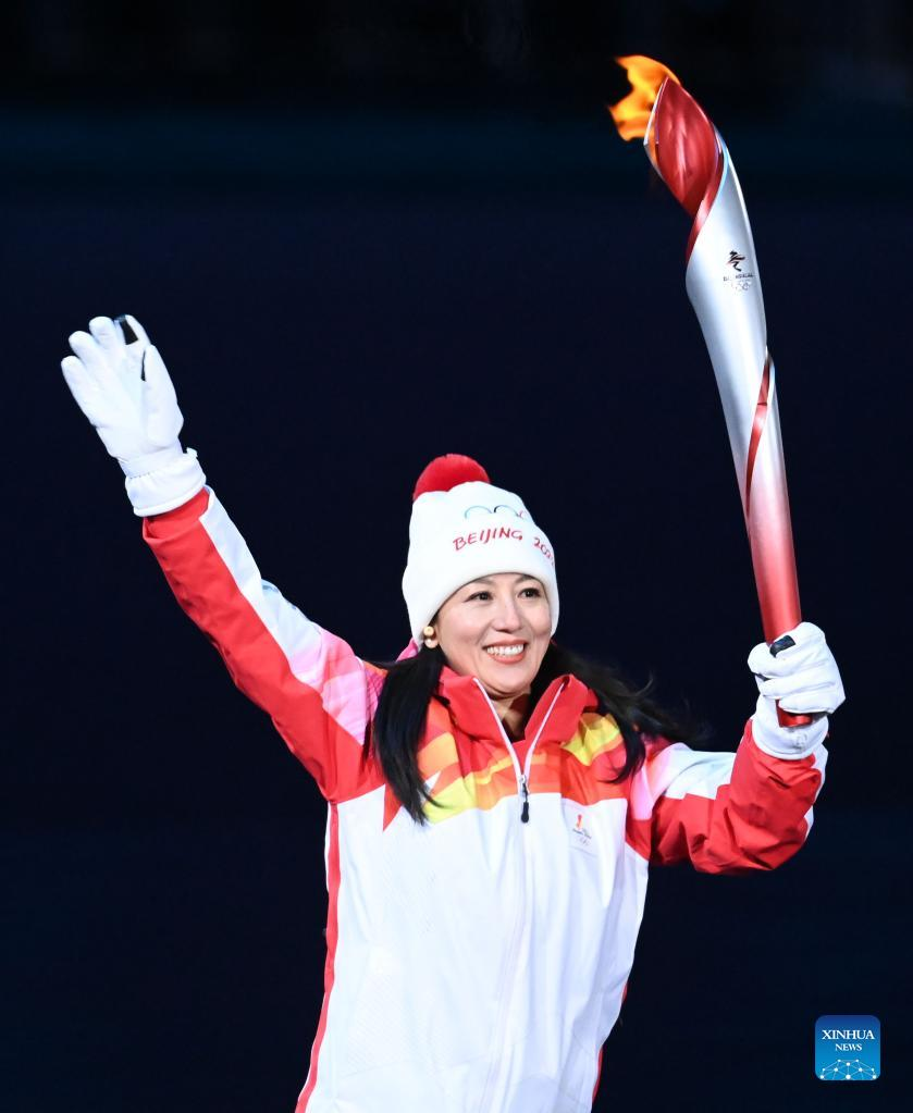 Torch bearer Yang Yang gestures during the opening ceremony of the Beijing 2022 Olympic Winter Games at the National Stadium in Beijing, capital of China, Feb. 4, 2022. (Xinhua/Li Ga)