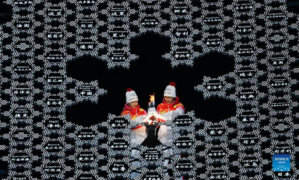 Torch bearers Dinigeer Yilamujiang (L) and Zhao Jiawen set the torch into the Olympic cauldron during the opening ceremony of the Beijing 2022 Olympic Winter Games at the National Stadium in Beijing, capital of China, Feb. 4, 2022. (Xinhua/Li Ga)