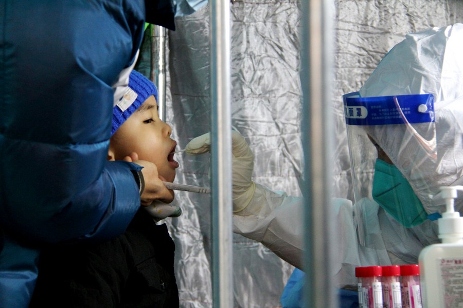 A medical worker takes a swab sample from a boy for nucleic acid test at a COVID-19 testing site in Fengtai District in Beijing, capital of China, Jan. 23, 2022. (Xinhua/Tang Rufeng)