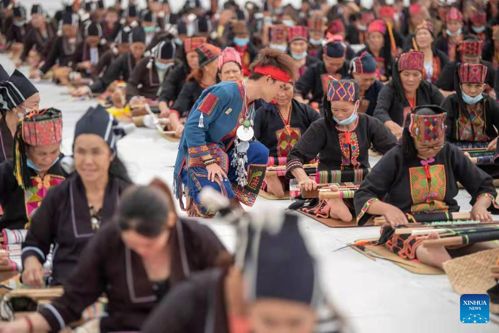 HAIKOU, Feb. 4 (Xinhua) -- During this year's Spring Festival holiday, Huang Yangwei's mother and elder sister were dressed up in new dresses with the Li ethnic brocade he had woven for them.