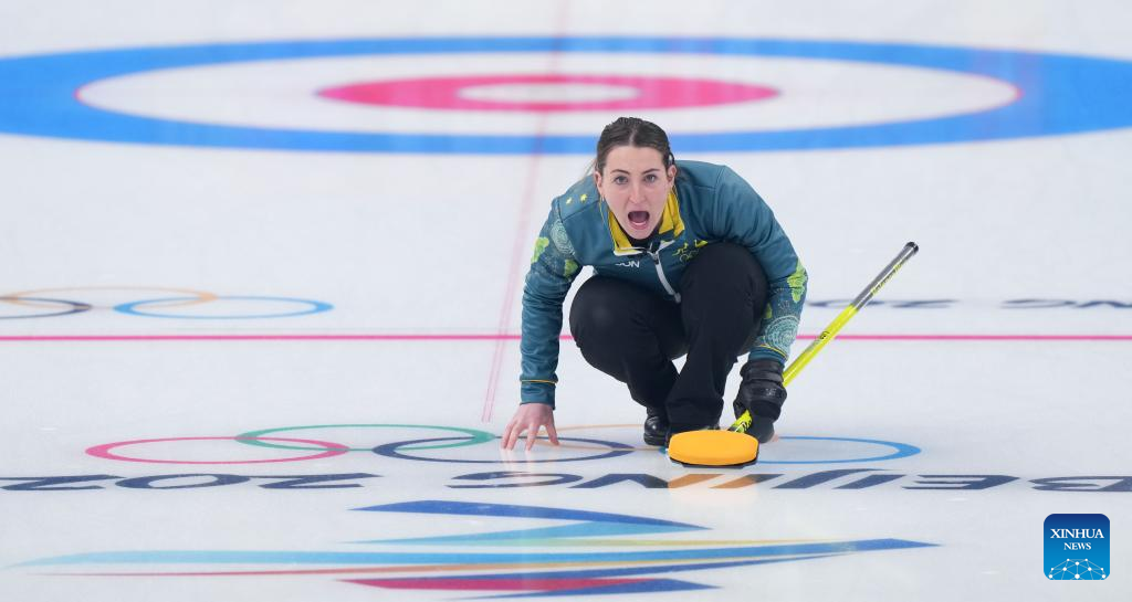 Tahli Gill of Australia competes during the curling mixed doubles round robin event of the Beijing 2022 Winter Olympics between Norway and Australia at National Aquatics Centre in Beijing, capital of China, Feb. 5, 2022. (Xinhua/Zhou Mi)