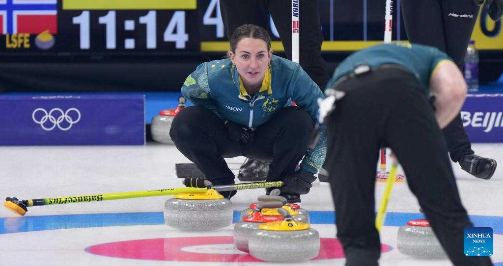 Tahli Gill (L) of Australia competes during the curling mixed doubles round robin event of the Beijing 2022 Winter Olympics between Norway and Australia at National Aquatics Centre in Beijing, capital of China, Feb. 5, 2022. (Xinhua/Zhou Mi)
