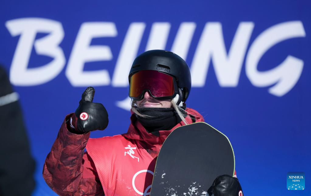 Laurie Blouin of Canada reacts during women's snowboard slopestyle qualification match at the Genting Snow Park in Zhangjiakou, north China's Hebei Province, Feb. 5, 2022. (Xinhua/Xue Yubin)