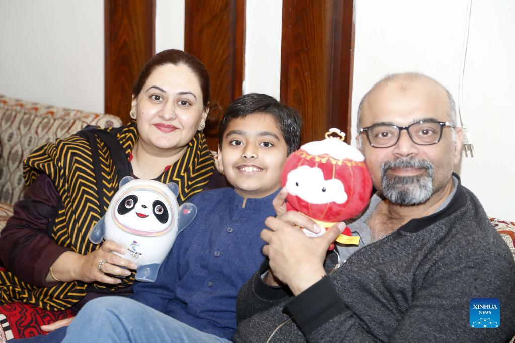 A family pose for a photo with the mascots of the Beijing 2022 Olympic Winter Games and the Paralympic Winter Games, in Rawalpindi, Pakistan on Feb. 4, 2022. (Xinhua/Ahmad Kamal)