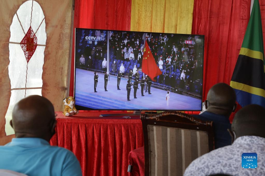 Tanzanian guests watch the opening ceremony of the Beijing 2022 Olympic Winter Games at the Chinese Embassy in Dar es Salaam, Tanzania on Feb. 4, 2022. (Photo by Herman Emmanuel/Xinhua)