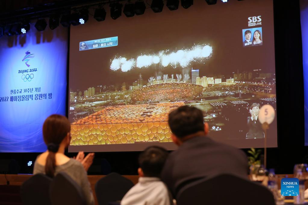 People watch the opening ceremony of the Beijing 2022 Olympic Winter Games in PyeongChang, South Korea, Feb. 4, 2022. (Xinhua/Wang Yiliang)
