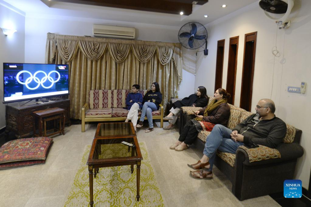A family watch the opening ceremony of the Beijing 2022 Olympic Winter Games in Rawalpindi, Pakistan on Feb. 4, 2022. (Xinhua/Ahmad Kamal)