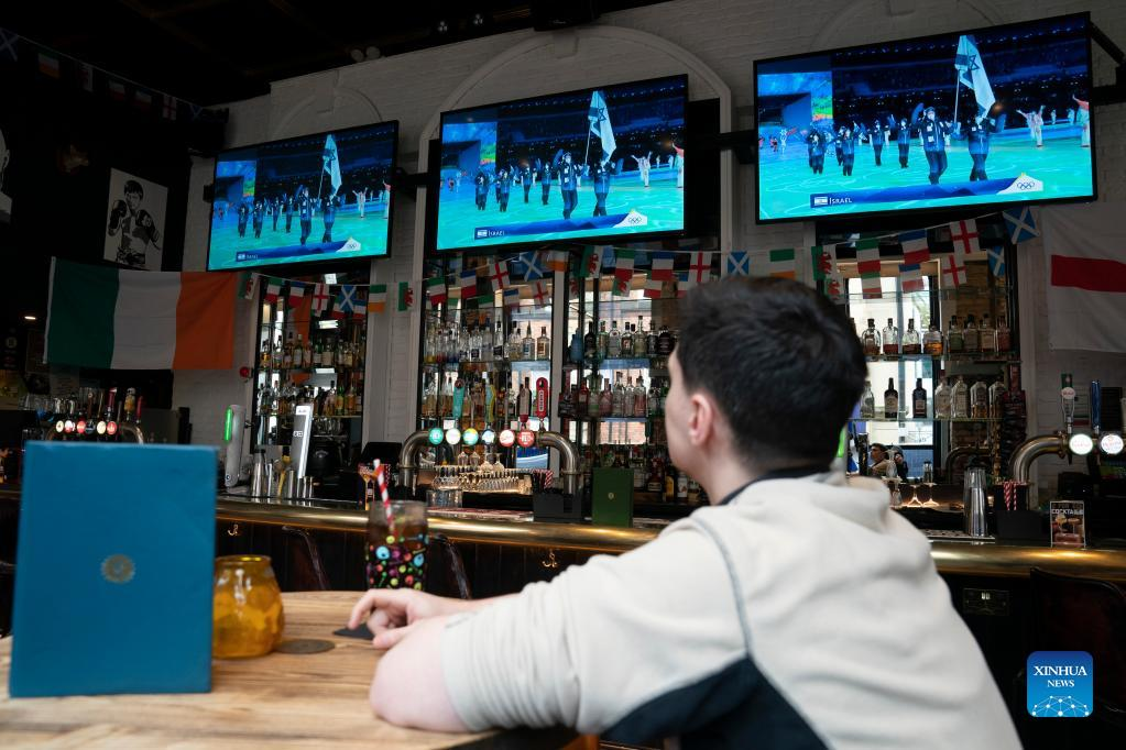 A man watches the live broadcast of the opening ceremony of the Beijing 2022 Olympic Winter Games in Manchester, Britain, Feb. 4, 2022. (Photo by Jon Super/Xinhua)