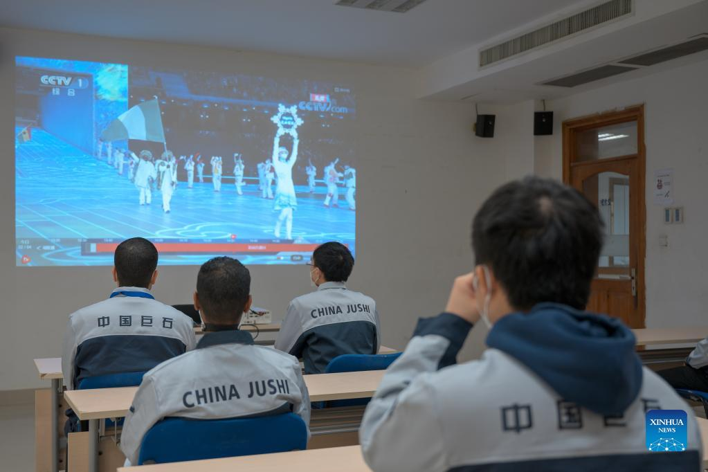 Chinese and Egyptian employees of the branch of China's fiberglass manufacturer Jushi in Egypt watch the opening ceremony of the Beijing 2022 Olympic Winter Games in Egypt, on Feb. 4, 2022. (Photo by Yan Fei/Xinhua)