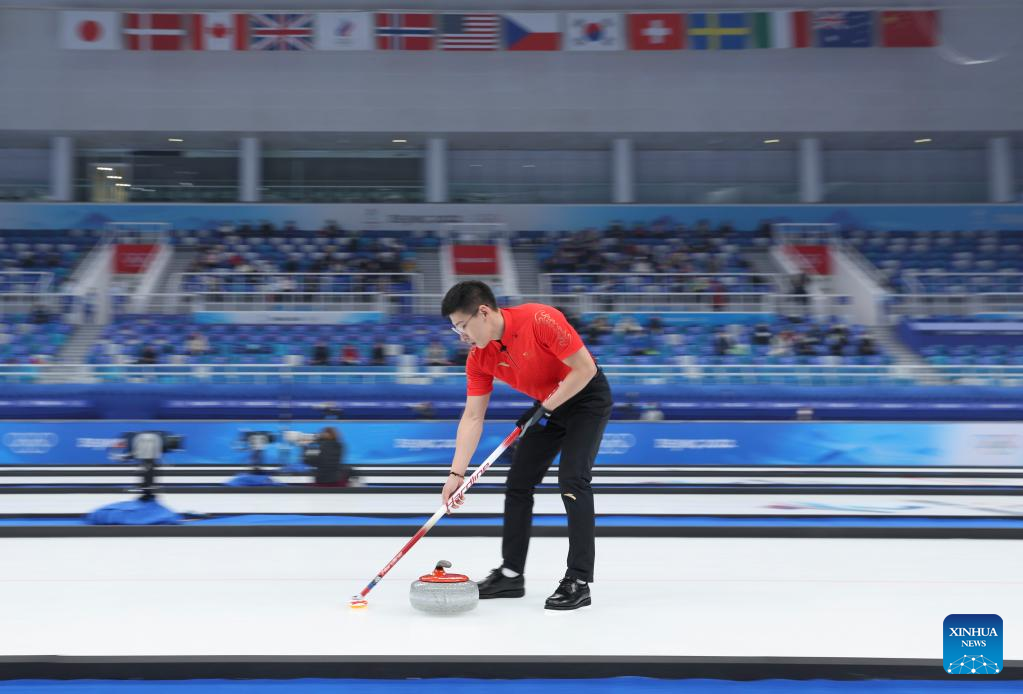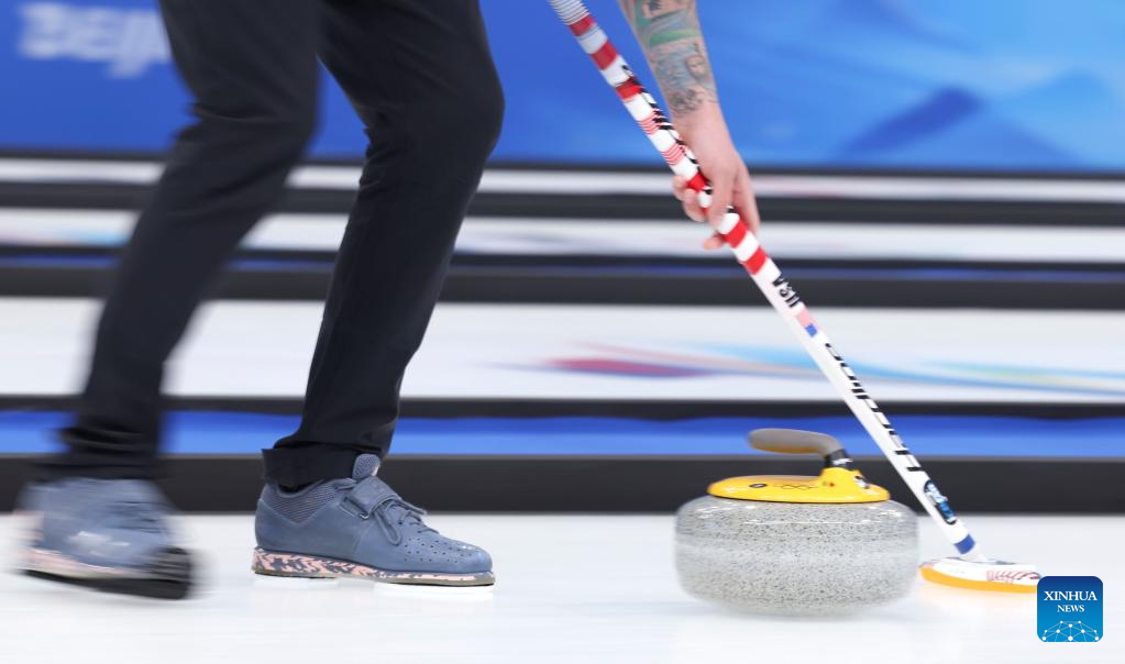 Christopher Plys of the United States competes during the curling mixed doubles round robin event of the Beijing 2022 Winter Olympics between China and the United States at National Aquatics Centre in Beijing, capital of China, Feb. 5, 2022. (Xinhua/Wang Jingqiang)