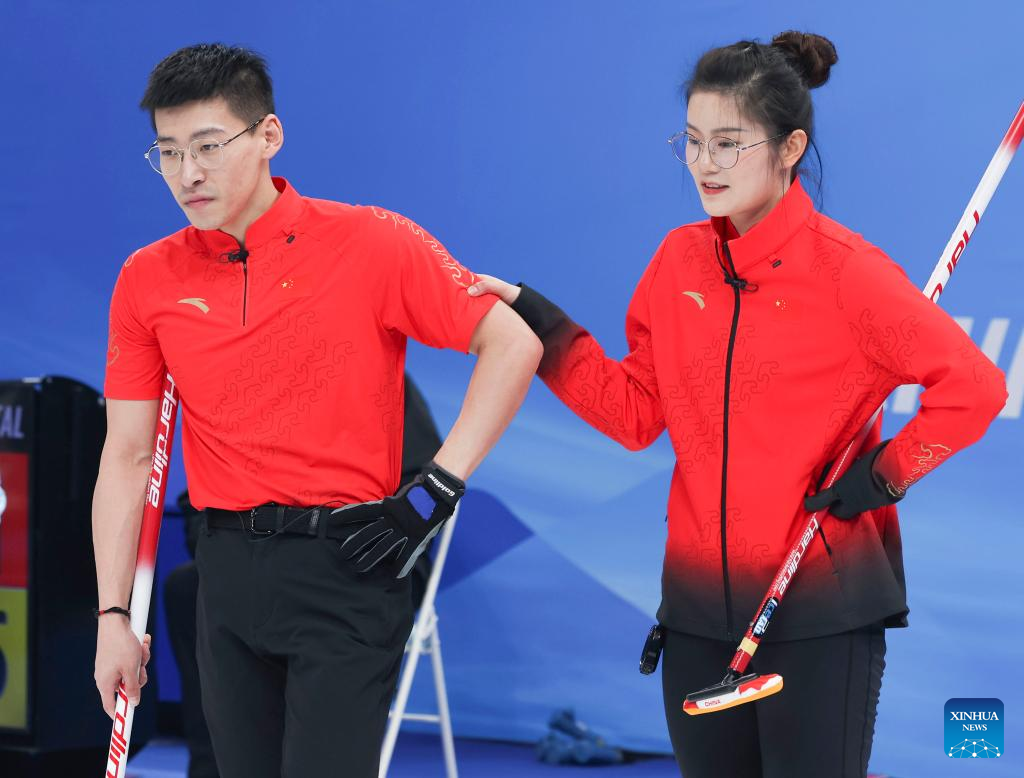 Fan Suyuan (R) of China comforts her teammate Lin Zhi during the curling mixed doubles round robin event of the Beijing 2022 Winter Olympics between China and the United States at National Aquatics Centre in Beijing, capital of China, Feb. 5, 2022. (Xinhua/Wang Jingqiang)