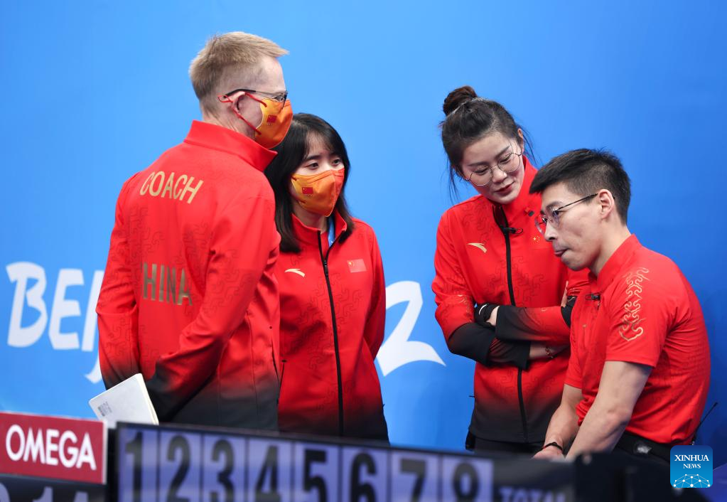 Fan Suyuan (2nd R) and Ling Zhi (1st R) of China talk to coaches during the curling mixed doubles round robin event of the Beijing 2022 Winter Olympics between China and the United States at National Aquatics Centre in Beijing, capital of China, Feb. 5, 2022. (Xinhua/Wang Jingqiang)