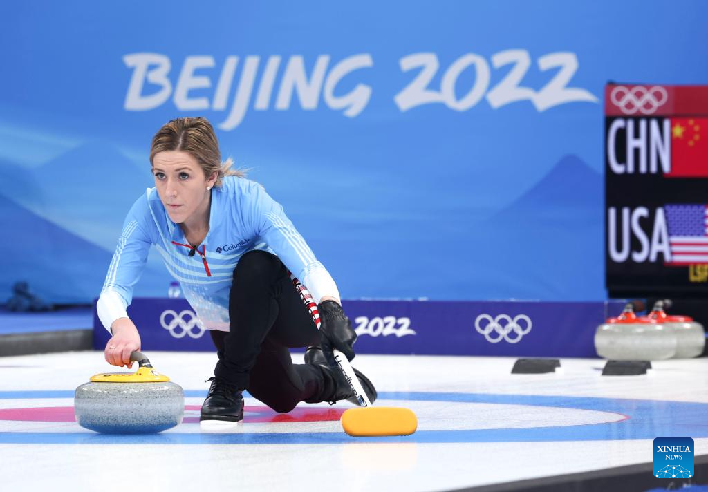 Vicky Persinger of the United States competes during the curling mixed doubles round robin event of the Beijing 2022 Winter Olympics between China and the United States at National Aquatics Centre in Beijing, capital of China, Feb. 5, 2022. (Xinhua/Wang Jingqiang)
