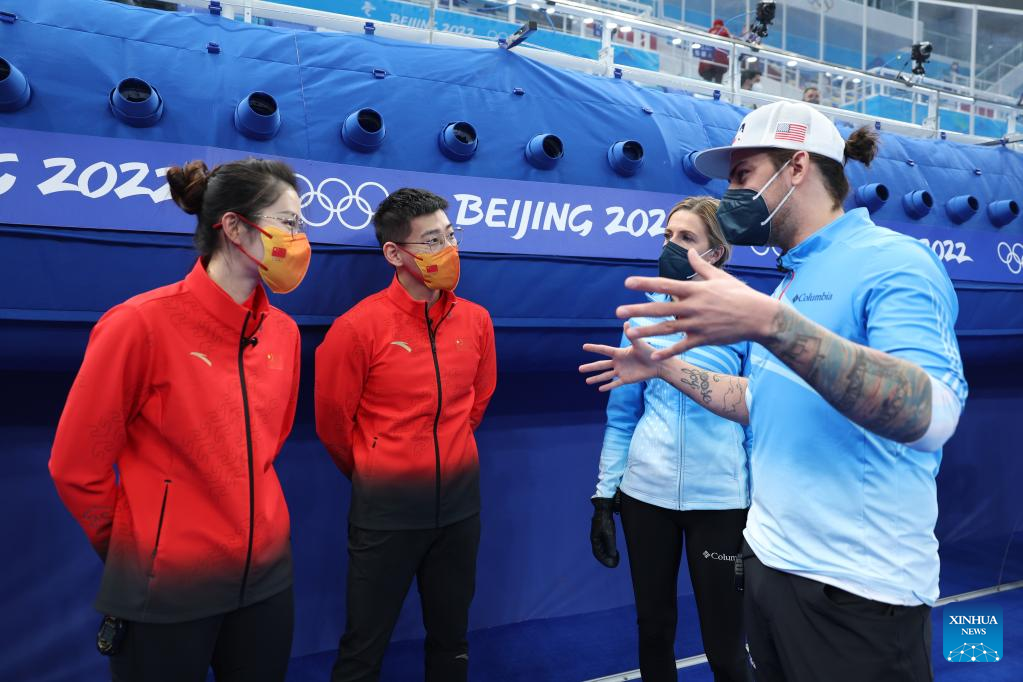 Fan Suyuan (L) /Ling Zhi (2nd L) of China chat with Christopher Plys (R) /Vicky Persinger of the United States prior to the curling mixed doubles round robin event of the Beijing 2022 Winter Olympics between China and the United States at National Aquatics Centre in Beijing, capital of China, Feb. 5, 2022. (Xinhua/Wang Jingqiang)