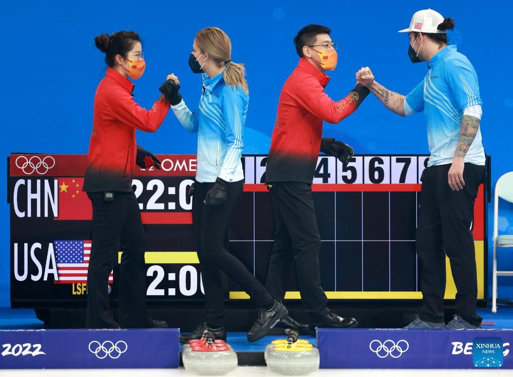 China's atheletes Fan Suyuan (1st L) and Ling Zhi (2nd R) greet their opponents Vicky Persinger (2nd L) and Christopher Plys of United States during the curling mixed doubles round robin event of the Beijing 2022 Winter Olympics between China and the United States at National Aquatics Centre in Beijing, capital of China, Feb. 5, 2022. (Xinhua/Liu Xu)